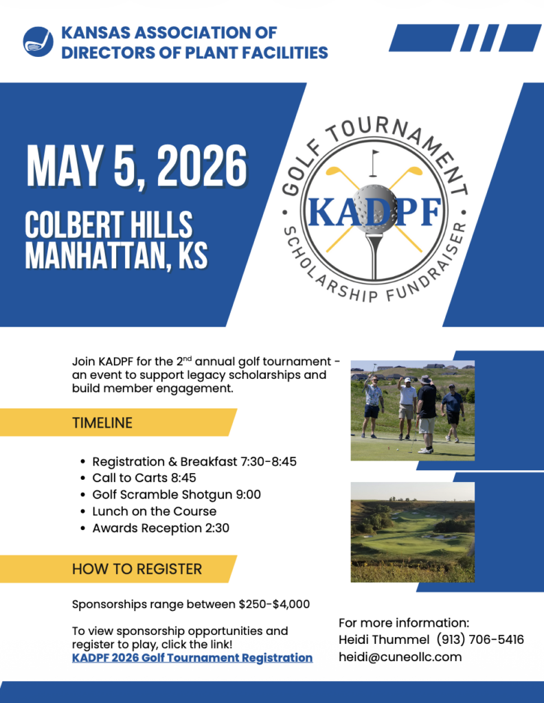 The Kansas Association of Directors of Plant Facilities (KADPF) was founded in the mid-1950s to connect maintenance and custodial personnel across Kansas. Its purpose was to create a network where facility professionals could share experiences, learn from each other’s successes and mistakes, and improve the operation of educational facilities statewide.